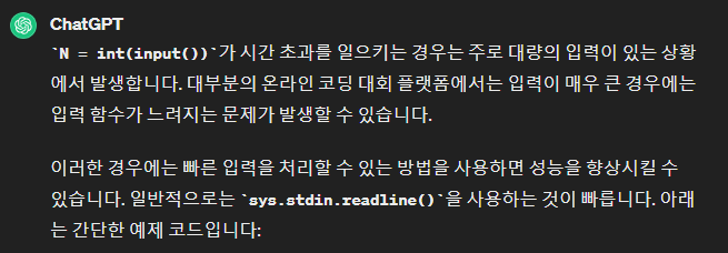 N = int(input()) 으로 입력을 받으면 시간 초과로 문제를 해결할 수 없다.