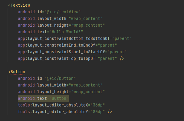 오류가 뜨지 않는 텍스트뷰와 오류가 뜨는 버튼을 비교해 보았을 때 제약조건이 없는 것을 확인할 수 있다.