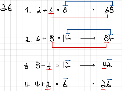 1) 각 자리수를 더했을 때 2 + 6 = 8 / 26의 오른쪽 자리 수 6, 구한 합의 가장 오른쪽 자리 수 8을 붙여 68이 된다.